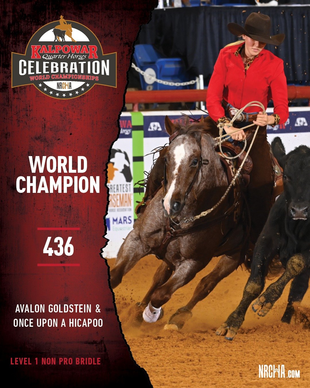 2026 Team Titles 2026 NRCHA Celebration of Champions NRCHA World Champions fb post NRCHA – Feb 18Congratulations to today’s champion in the Level 1 Non Pro Bridle!Avalon Goldstein & Once Upon A Hicapoo (Once In A Blu Boon x SDP Hydriven Hicapoo) with 436 points (R: 213.5/C: 222.5)